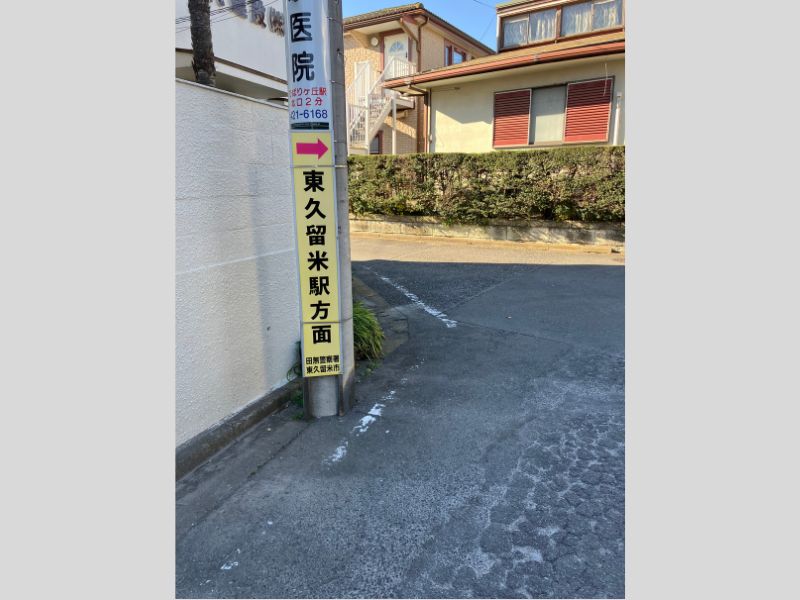 東久留米方面へは、線路脇を道が通っています。これをたどれば行けそうだ、と思いたくなります。実際、道なりに行くと、途中の電信柱には「東久留米駅方面」という看板もあります。でも、ほとんどウソです。道なり(とはいってもすぐに左折が必要)に行っても、やがてその道は大きな畑(現在、住宅が建設中)に直面します。ちょっと左にあるまっすぐの道はクルマで進入したくない狭さ、右はどこに行くのか想像がつきません。いわばここで道は消えてしまうのです。