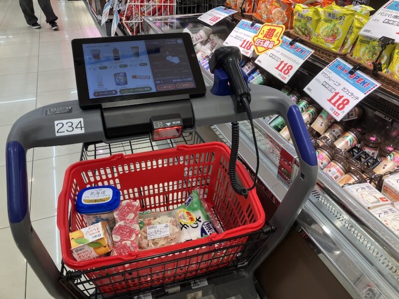売りの一つが全国のトライアルで導入されているレジカートの導入だ。顧客はカートにプリペイドカードかスマホアプリを登録して、買い物をしながら付属のスキャナーで商品バーコードを読み取る。店員のチェック後、専用ゲートを通過するだけで会計が完了する。「レジの待ち時間が大幅に短縮される」という触れ込みだが、この日は慣れていないためか、これまでのカートとレジで精算を済ませる客がほとんどだった。