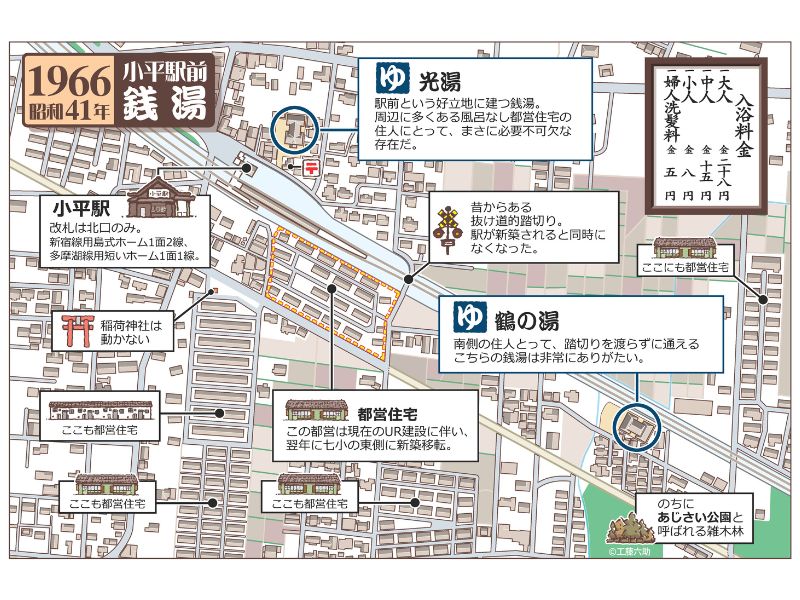 小平駅北口、現在の郵便局跡地の奥、今のパチンコ屋さんの敷地にあるのは「光湯」。駅南口の東側、今の小平駅東栄通り回田道に出る少し手前の線路側にあるのが「鶴の湯」。