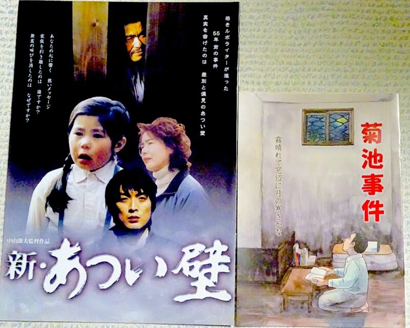 「新・あつい壁」は2007年公開の中山節夫監督作品で、「フィクション」と断っているが、菊池事件に題材を取っている。たまたま事件を知った若いルポライターが熊本現地に取材し、ハンセン病回復者ら関係者から証言を集める中で事件捜査や裁判への疑問を深め、差別の理不尽さに目覚めていく過程を描いている。