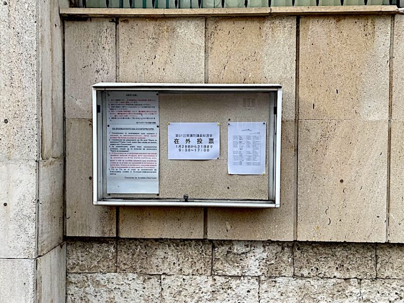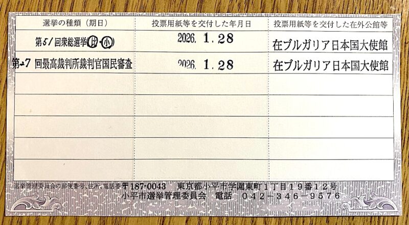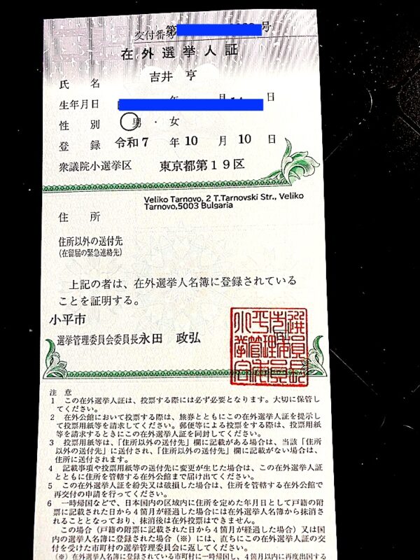 出国前の9月、自宅がある東京都小平市選挙管理委員会で申請、4カ月後の投票になった。「衆議院小選挙区 東京都第19区」と書かれた「在外選挙人証」が11月、首都ソフィアにある在ブルガリア日本国大使館から送られてきた。