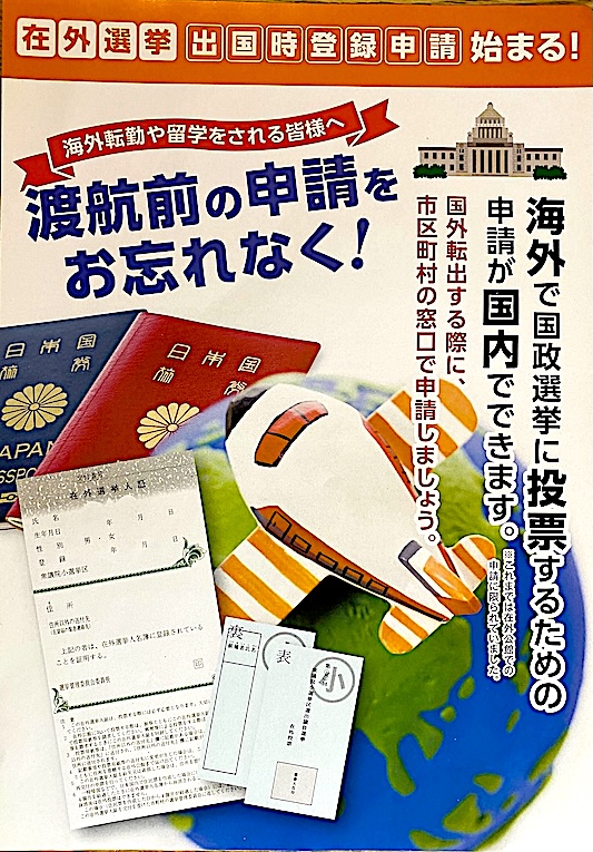 総務省は2018年、在外公館で受け付けていた「在外選挙出国時登録申請」が、出国前の市区町村でもできるよう改正。「海外転勤や留学をされる皆様へ 渡航前の申請をお忘れなく!」と呼びかける。