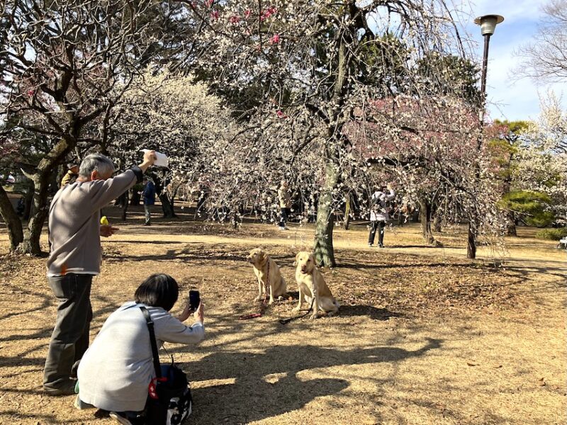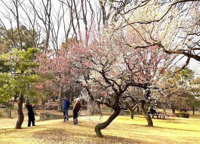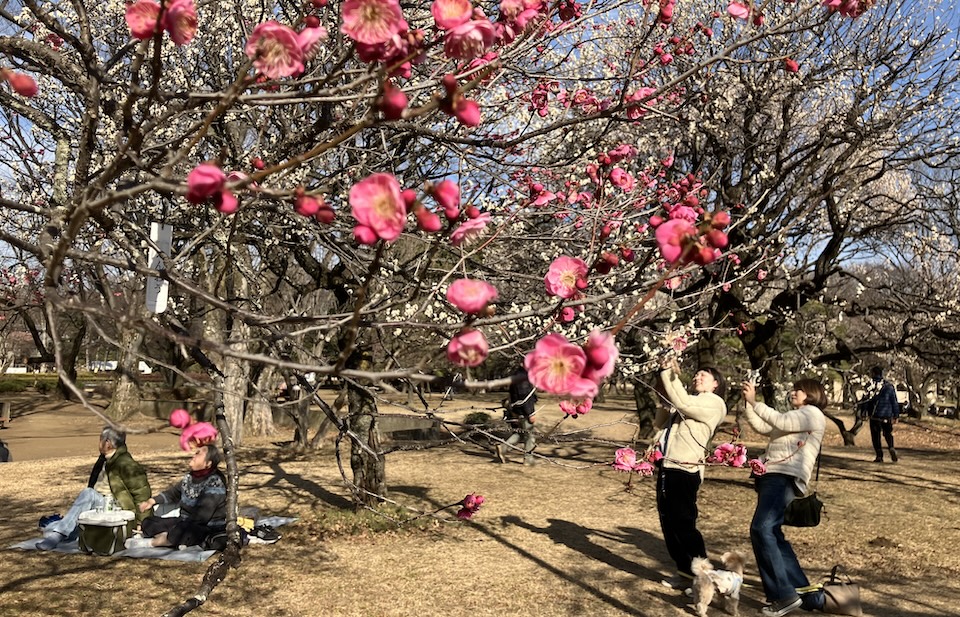 立春を迎えて日差しも春めくなか、小金井公園の27種、100本近い梅が次々に咲き誇っている。梅林を散策し、写真を撮ったりほのかな香りを楽しんだりする来園者が増えてきた。