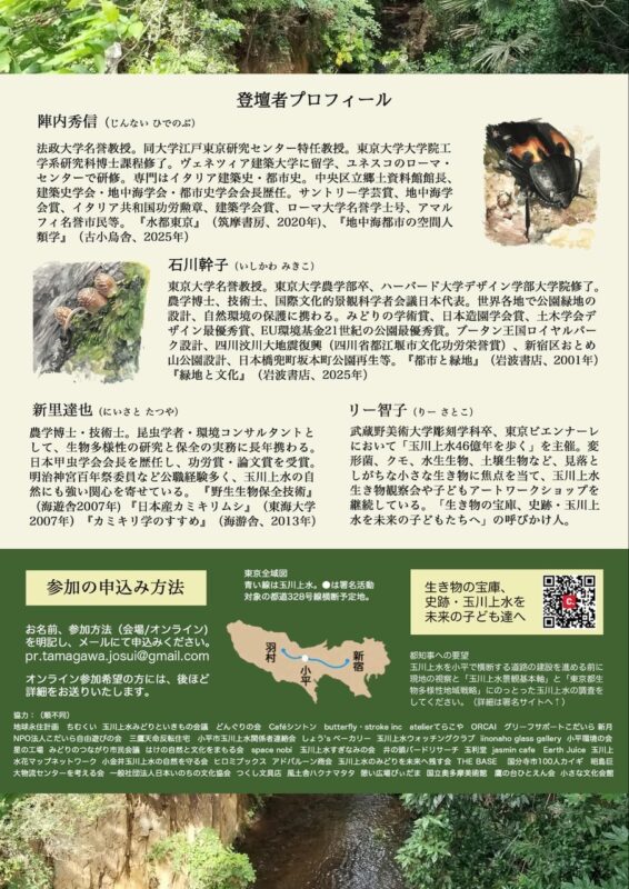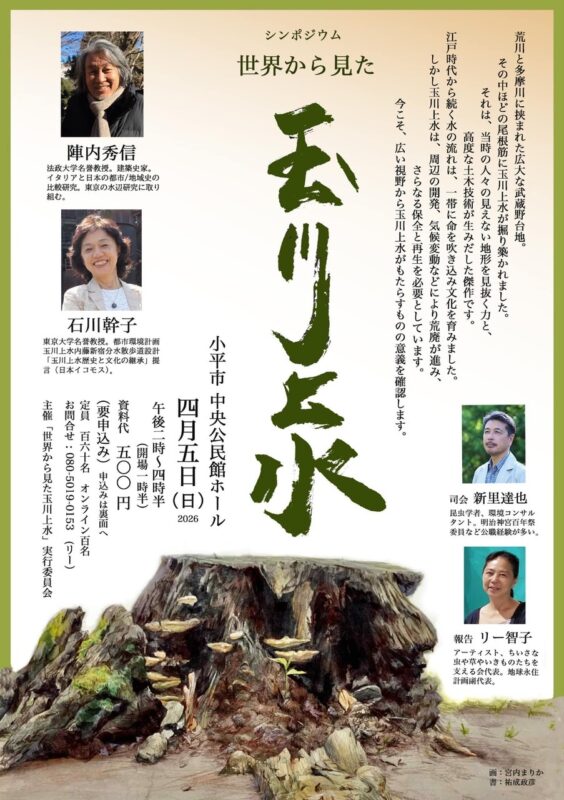 シンポジウムには、海外での研究や知見がある4人が登壇、玉川上水の国際的な価値について意見を交わす。イタリア建築史・都市史が専門で、『水都東京』(筑摩書房)の著書がある陣内秀信・法政大名誉教授。『緑地と文化』(岩波書店)の著者で、世界各地で公園緑地の設計、自然環境の保護に携わる石川幹子・東京大名誉教授。環境コンサルタントで、昆虫学者の新里達也さん。『野生生物保全技術』(海遊舎)の著書がある。リー智子さんは、地元の市民団体による署名活動、「生き物の宝庫、史跡玉川上水を未来の子どもたちへ」の呼びかけ人。署名活動では、東京都の玉川上水保全への姿勢を規定する「玉川上水景観基本軸」や「生物多様性地域戦略」に沿った調査と知事の「現地」視察を要望する。