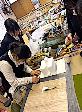 複合施設前の「ひろば」には小林洋子市長と隈研吾氏の人物模型も配置。4月から新部長となる高校1年の井上心さんは「人物の配置に関しては、ただ置くだけではなくて、今動いているという臨場感を出すために気を配りました」と話す。