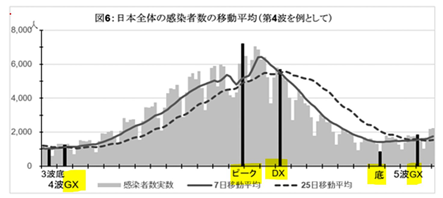 グラフの曲線である「7日線」が「25日線」の上にくる点(golden cross: GX)→感染者のピーク→7日線が25日線の下になる点(dead cross: DX)→感染者の底→次のGX というサイクルになっていることが視覚的に理解できると思う。
