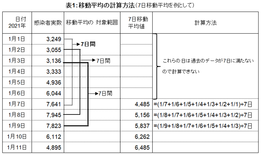 移動平均値の求め方は、「7日移動平均」なら、当日を含む過去7日分の実数を足して、7日で割った値がその日の移動平均値になる。計算例は表1の通り。