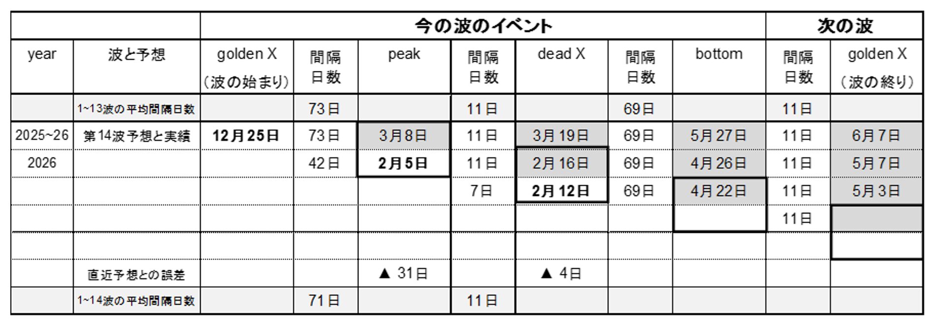 表を見ると「GX」から「ピーク」までの平均間隔日数(1波から13波まで)は73日なので、12月25日に73日を足すとピークの予測日ができる。予想日は2026年3月8日となった。しかし、「実際のピーク」が発生したのは2月5日。これは予想日より31日も早く発生した例外的なケースだった。