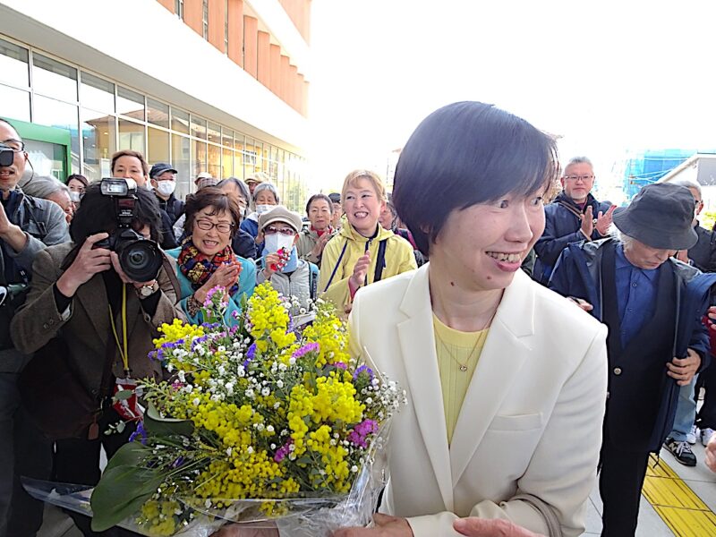 午前9時、市役所正面入り口前に詰め掛けた支援者ら約100人が拍手で迎える中、原田市長は笑顔で花束を受け取り、「市民が主役といえるまちづくりをと訴えて市長に押し上げていただいた。清瀬に住んでよかったと思える市政に向けて頑張りたい」とあいさつした。