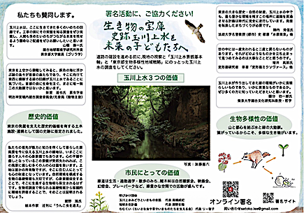 玉川上水をまたぐ幅36メートルの都道が建設中だ。会場では、着工前の都知事の現地視察と生物多様性や景観保全などの調査を求める署名用紙も配られた。
